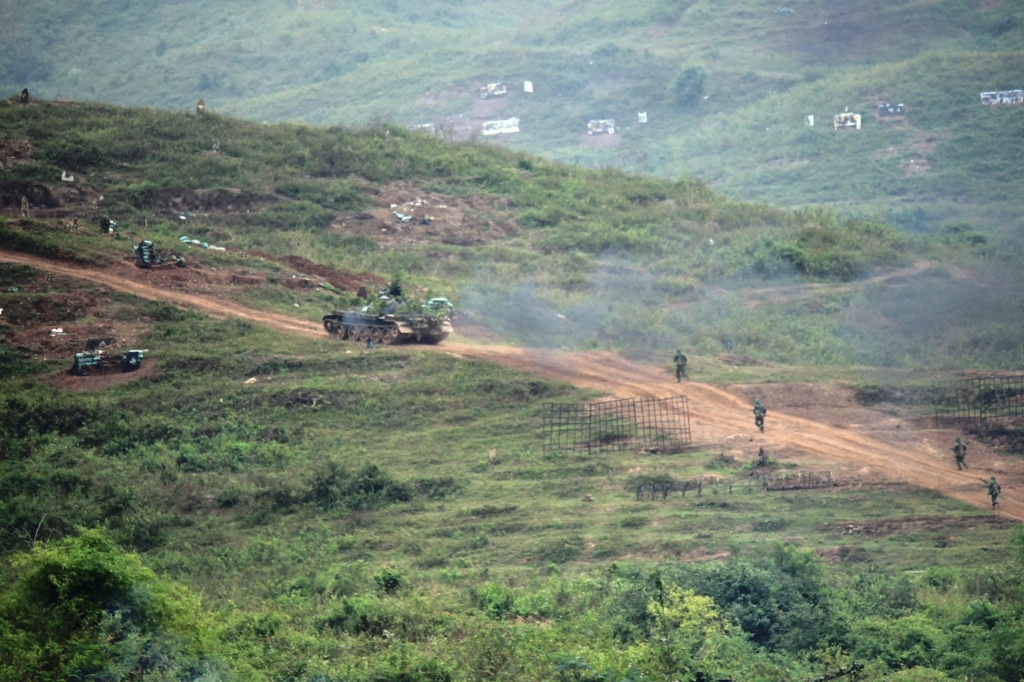 Xe tăng của Lữ đoàn 201 (Binh chủng Tăng Thiết giáp) dàn đội hình dùng hỏa lực tiêu diệt các mục tiêu.