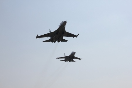 | Biên đội Su 30MK2 trên đường bay tuần tiễu biển đảo. Khác với bay huấn luyện, trong những chuyến bay làm nhiệm vụ trinh sát, tuần tiễu, khẳng định chủ quyền, bảo vệ bầu trời, vùng biển, đảo tiền tiêu phía Nam của tổ quốc, Su 30MK2 thường trang bị vũ khí. |