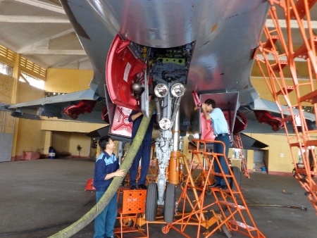 | Phi công tiếp nhận máy bay, kiểm tra tình trạng vũ khí. Người trong ảnh là đại tá phi công Nguyễn Xuân Tuyến, nguyên trung đoàn trưởng Trung đoàn 935, hiện là Phó sư đoàn trưởng Sư đoàn không quân 370. |