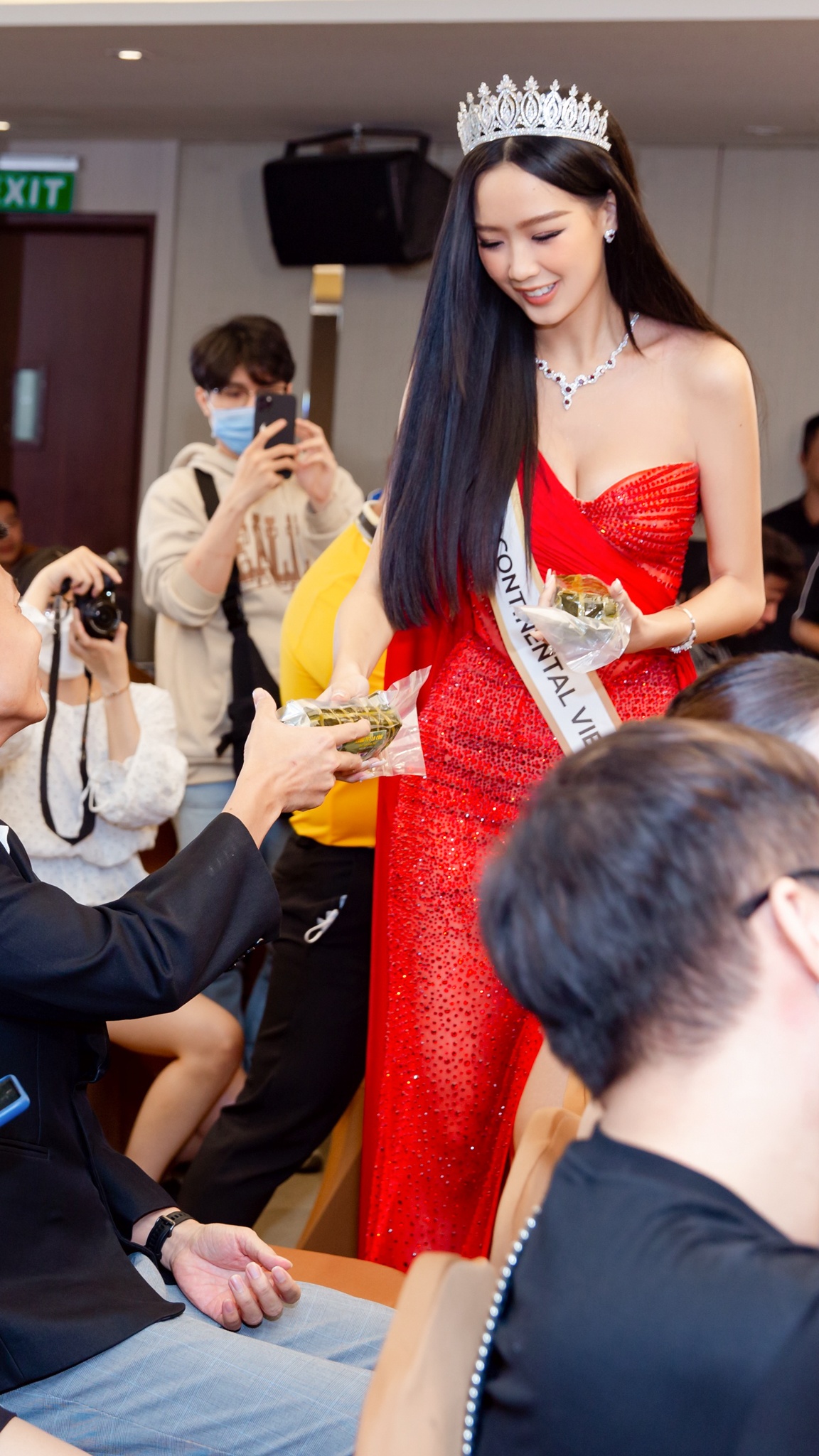 | Lần đầu được tặng bánh tét, đương kim Miss Intercontinental Cinderella Faye Obeñita tỏ rất ngạc nhiên và vui mừng. Cô ấy cũng chia sẻ cho tôi nhiều bí kíp để chinh phục vương miện cao nhất tại cuộc thi. Nhận được sự động viên từ Cinderella, tôi thấy tin tưởng hơn về bản thân. |
