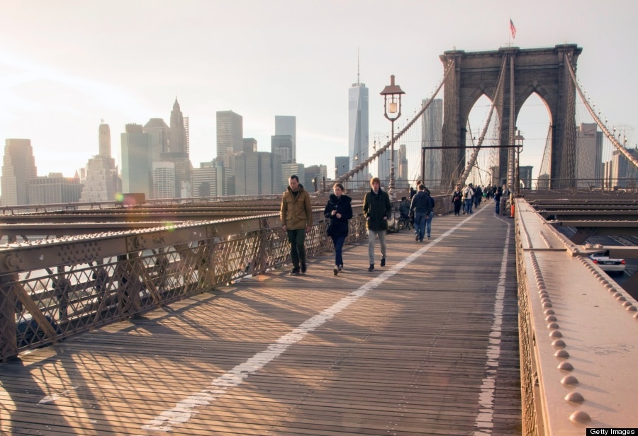 Khói bốc lên từ tòa tháp phía bắc trung tâm thương mại thế giới trong khi bụi từ sự cố ở tháp phía nam lan ra xung quanh. Bức ảnh được chụp từ cầu Brooklyn. Ảnh: REX/Getty