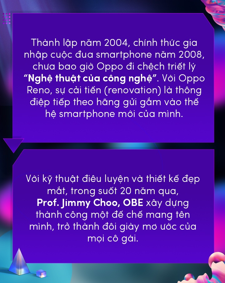 “Đây là món quà phong cách mà Oppo Reno3 và Reno3 Pro muốn gửi đến người dùng của họ”, lời khẳng định từ nhà thiết kế Prof. Jimmy Choo, OBE chứng minh Oppo luôn đề cao tinh thần “renovation” (đổi mới) - điều mà thế hệ Reno series nói chung và Reno3 nói riêng mong muốn mang đến cho người dùng trẻ.