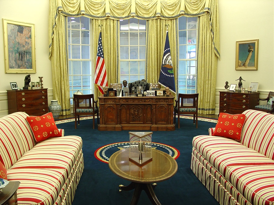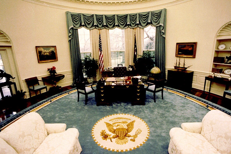 Phòng Bầu dục ở thời chính quyền Tổng thống George H.W.Bush (Bush cha). Ông là tổng thống thứ 41 của nước Mỹ và nắm quyền trong một nhiệm kỳ duy nhất từ 20/1/1989 tới 19/1/1993. Ông là cha đẻ của Tổng thống thứ 43 George W.Bush và cũng thuộc đảng Cộng hòa. Ảnh: Nhà Trắng |