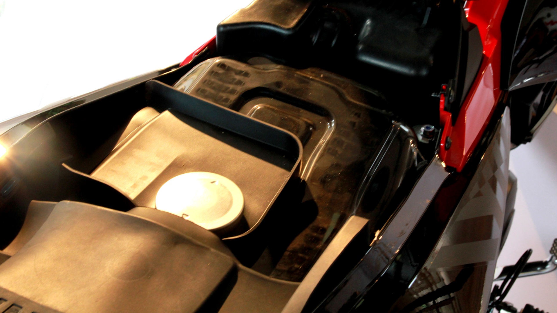 | Bình xăng trên M1 được lôi ra ngoài nhằm giảm thời gian tiếp nhiên liệu trên đường đua, yên xe cũng bị cắt mất chỗ ngồi vì vị trí đặt bình xăng. Exciter 150 có bình xăng phía trong yên, để đổ xăng, bạn phải mở khóa yên xe tương tự đa phần xe máy đang bán trên thị trường. |
