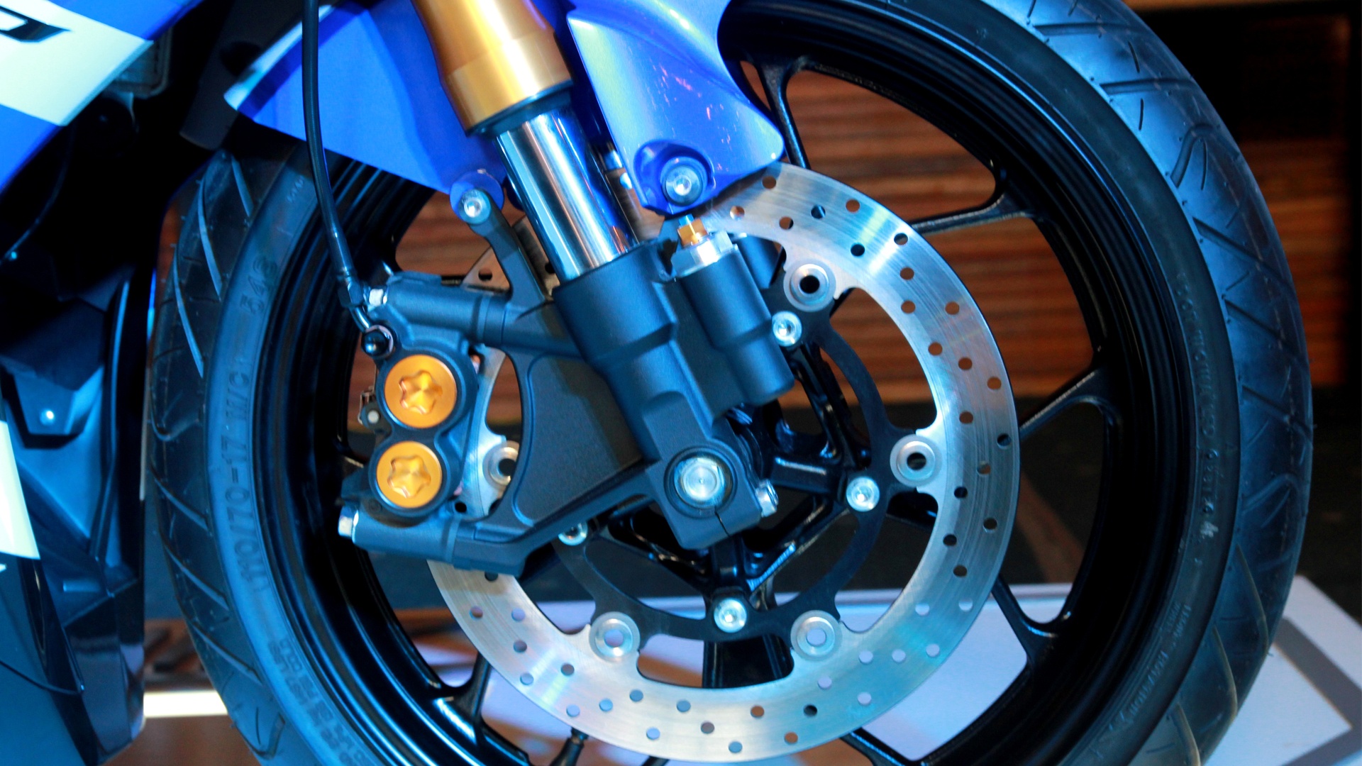 | Phanh trước trên M1 là loại sử dụng cho đường đua, đường kính lớn, cụm heo dầu 2 piston lấy từ mô tô thể thao R6. Xe được lắp cụm phuộc upside down dành cho xe thể thao. Trong khi đó, Exciter 150 sử dụng heo dầu piston đơn trên xe dân dụng, phanh đĩa đường kính 245mm. |