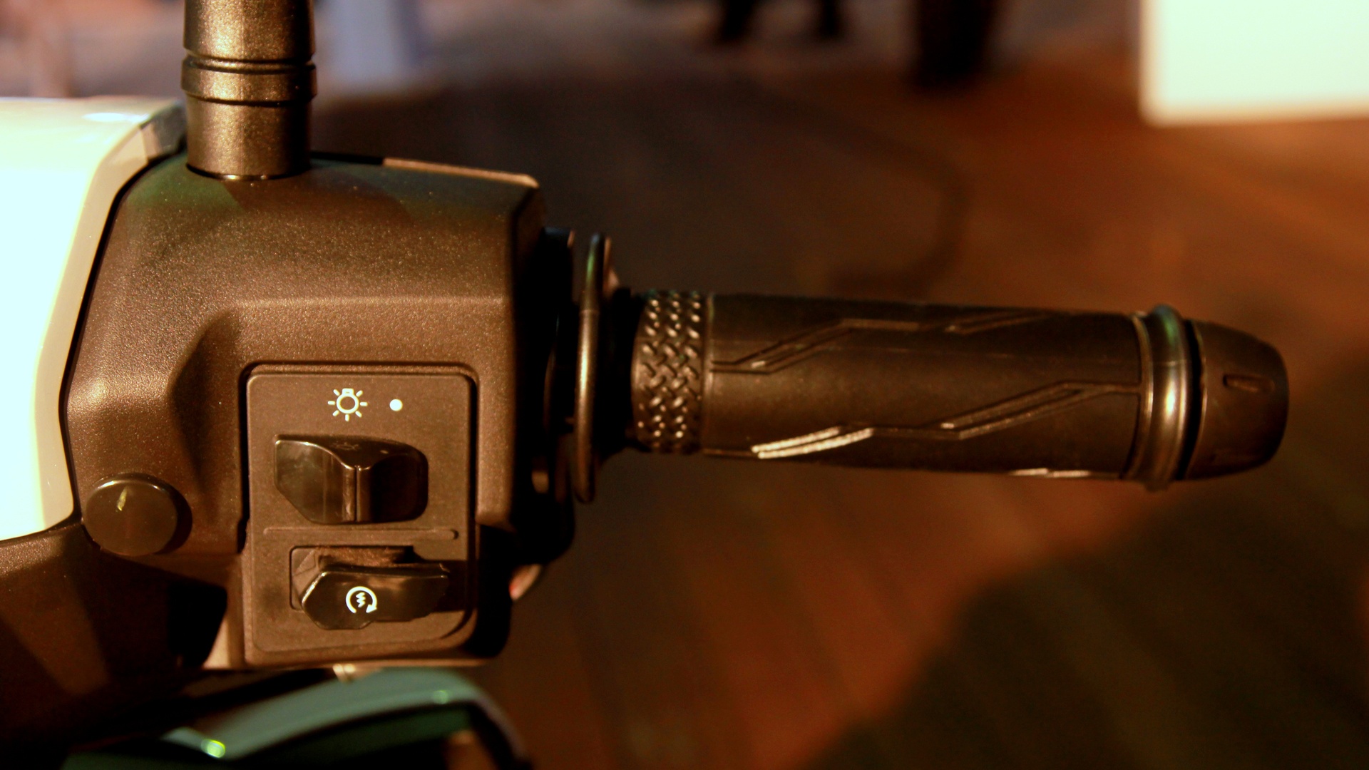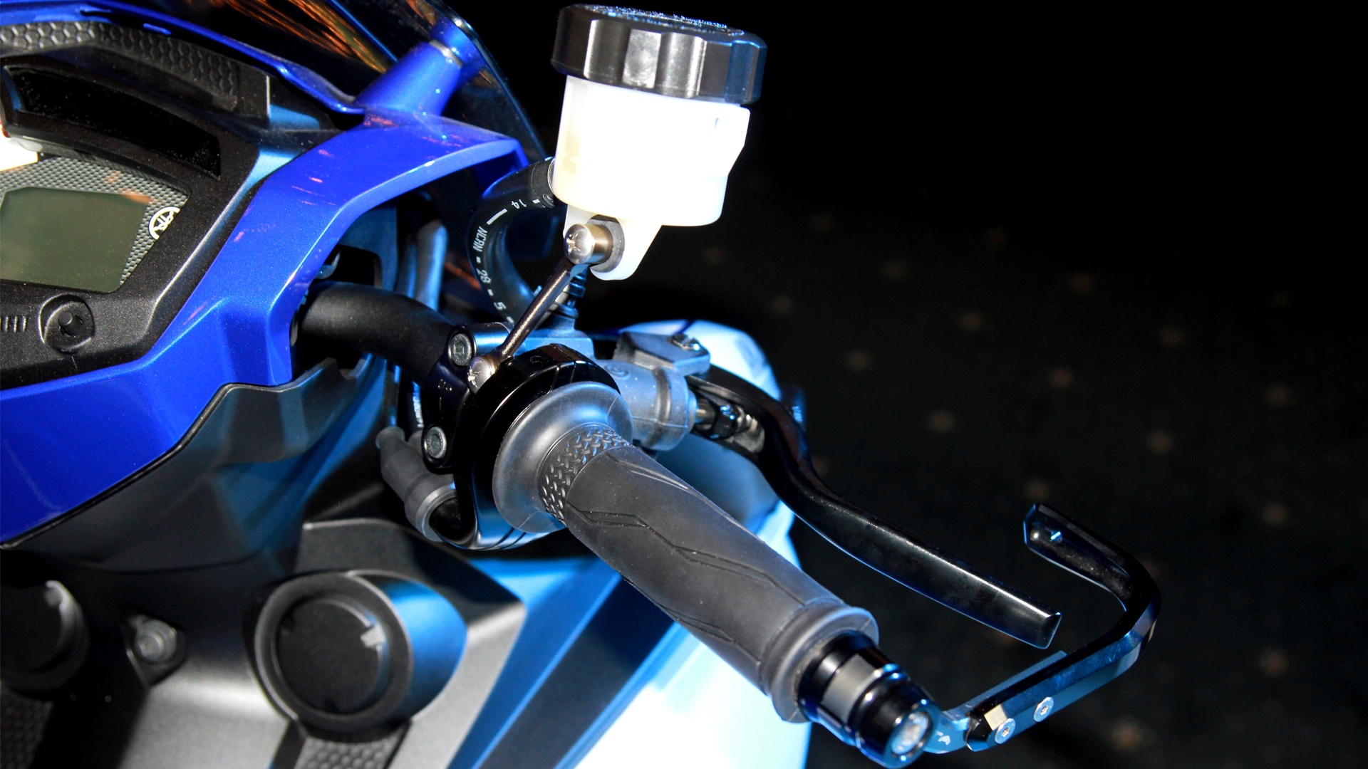 | Tay phanh trên M1 xuất hiện cùm bảo vệ, trong khi Exciter 150 không xuất hiện chi tiết này. Đặc biệt, bình dầu lớn trên xe đua GP được lắp trên bản độ này. Tay ga Exciter 150 khá đơn giản với công tắc khởi động điện và đèn. |
