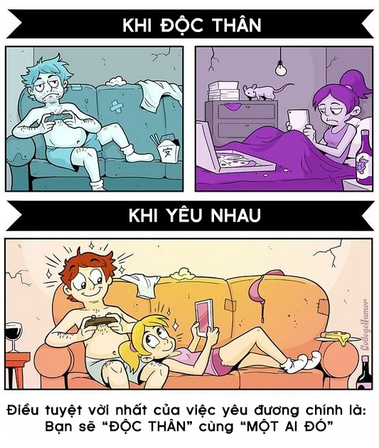 | Và có lẽ, điều tuyệt vời nhất của việc yêu đương chính là: bạn sẽ độc thân cùng với một ai đó, phải không nào? |
