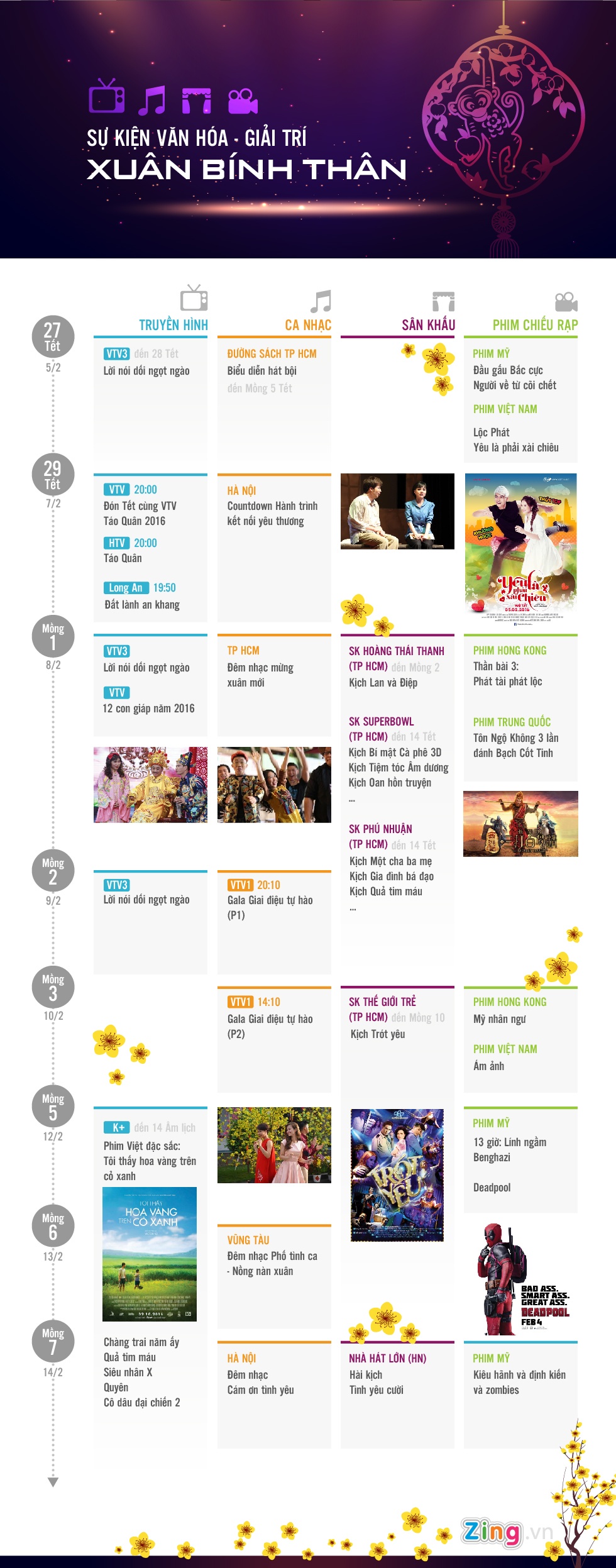 Chương trình Táo Quân 2016, 12 con giáp, loạt phim "Deadpool", "Mỹ nhân ngư"... đều là những sự kiện giải trí được khán giả chờ đón trong những ngày năm hết tết đến.
