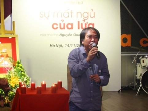 | Nhà thơ Quang Thiều trong buổi ra mắt Sự mất ngủ của lửa. |