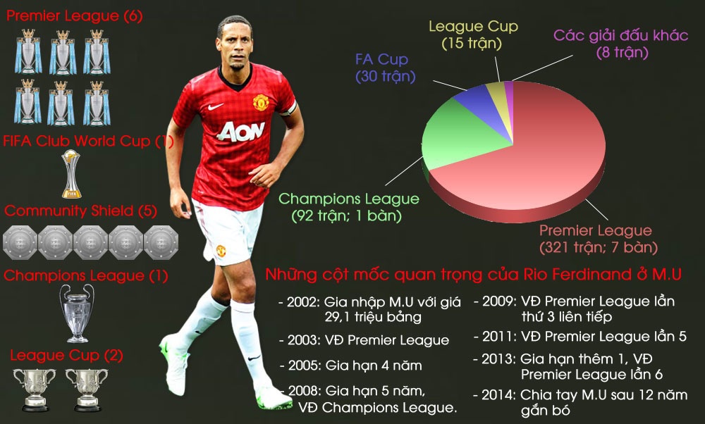 12 năm tại Old Trafford, Rio Ferdinand ra sân tổng cộng 455 trận, ghi 8 bàn và giành 15 danh hiệu. Ngày 12/5, trung vệ sinh ngày 7/11/1978 chính thức xác nhận chia tay Quỷ đỏ.