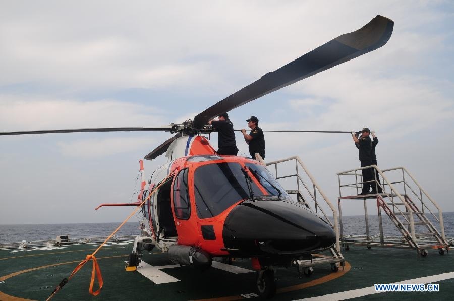 | Một trực thăng trên tàu cứu hộ Haixun 01 của Trung Quốc chuẩn bị cất cánh để tìm máy bay Malaysia vào ngày 16/3. Ảnh: Tân Hoa Xã |