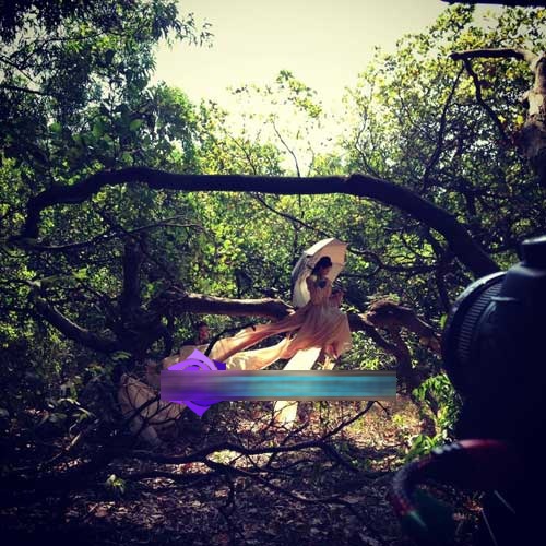 | Hồng Quế chụp hình trong rừng đúng đợt mưa bão, lại mặc đồ trắng nhưng cô vẫn phải cố gắng. |