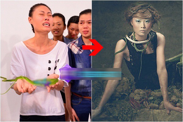 | Mai Giang trước khi có được tấm hình lạnh lùng bên phải đã đối diện với nỗi sợ hãi tột cùng khi làm quen với các chú rắn. |