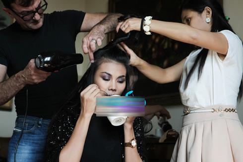 | Ngọc Trinh đang được stylist chỉnh lại dáng đứng sao cho đẹp. |