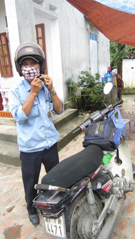 | Ông Phạm Phú Ngà chuẩn bị đi làm công việc bảo vệ bằng xe máy. |