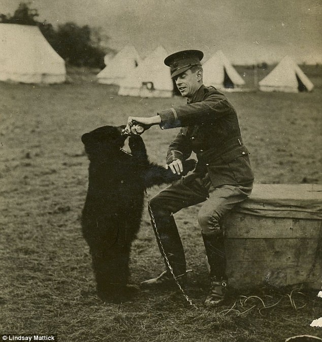 | Đại úy Harry Colebourn và Winne trong doanh trại. |