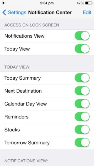 - Kiểm tra Trung tâm Thông báo: Trung tâm thông báo có rất nhiều thông tin mà bạn không cần dùng tới. Vào mục Cài đặt / Trung tâm thông báo (Settings / Notification Center) và tắt các nội dung không cần dùng tới như Chứng khoán hoặc Tóm tắt Hôm nay.