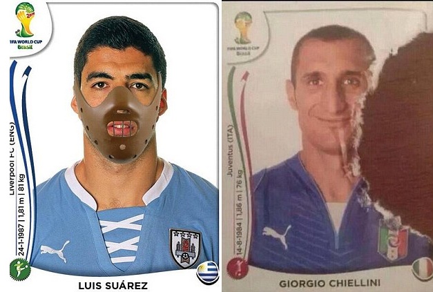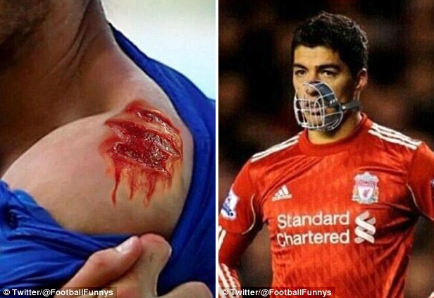 | Vết cắn trên vai Chiellini được cường điệu hóa còn Luis Suarez bị cư dân mạng đeo cho chiếc "rọ mõm" để chống cắn người. |