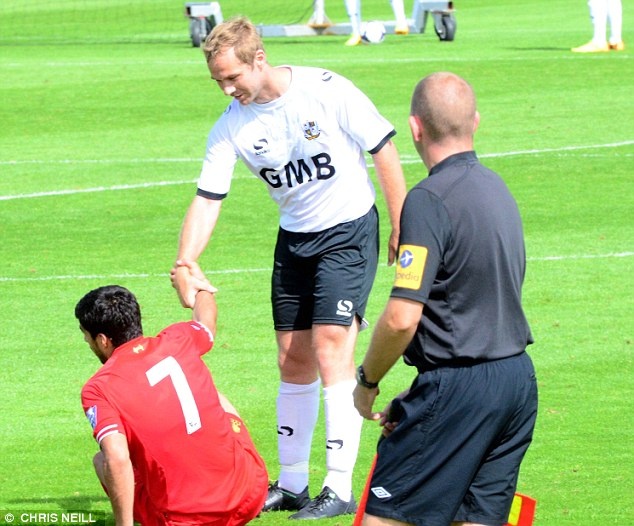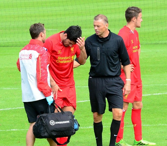| Lối chơi máu lửa của Suarez khiến anh không ít lần bị đau khi va chạm với cầu thủ đối phương. |