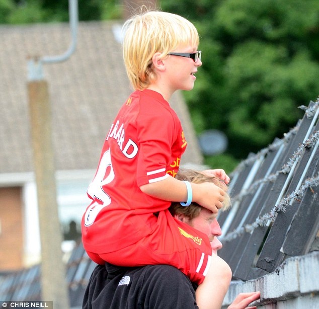 | Cha con CĐV của Liverpool kiệu nhau để xem Suarez thi đấu. |