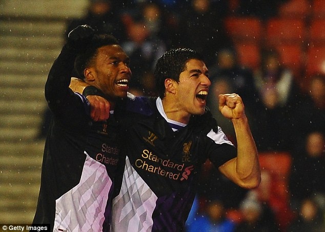 Niềm vui chiến thắng của cặp song sát Suarez - Sturridge bên phía Liverpool.