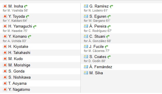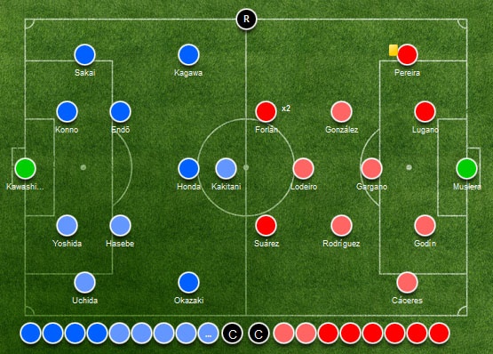 Trận đấu kết thúc với tỷ số 4-2 nghiêng về đại diện đến từ Nam Mỹ, các bàn thắng được ghi do công của Forlan (27', 29'), Suarez (52'), González (58'). Honda và Kagawa là những cầu thủ mang về bàn thắng danh dự cho Nhật Bản, các pha lập công lần lượt ở các phút 54 và 71 của trận đấu.