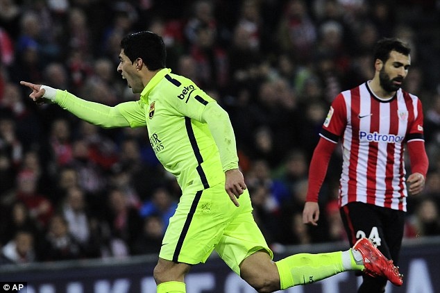 | Suarez ăn mừng sau khi kiến tạo cho Neymar lập công trong trận chung kết Cúp nhà vua. Ảnh: Daily Mail. |