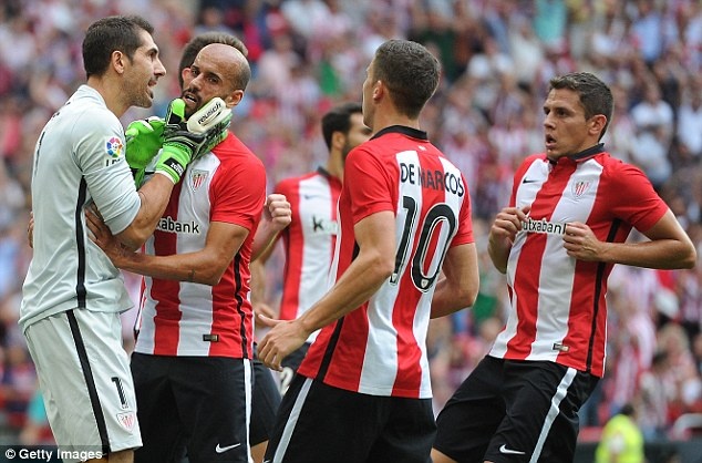 | Còn thủ thành Gorka Iraizoz Moreno nhận được sự chúc mừng của đồng đội sau khi cản phá cú sút 11 m của Messi. |