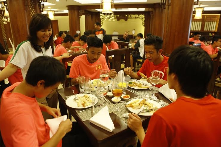 | Các cầu thủ U19 Việt Nam dùng bữa ăn tại khách sạn REX. Ảnh: Tùng Lê. |