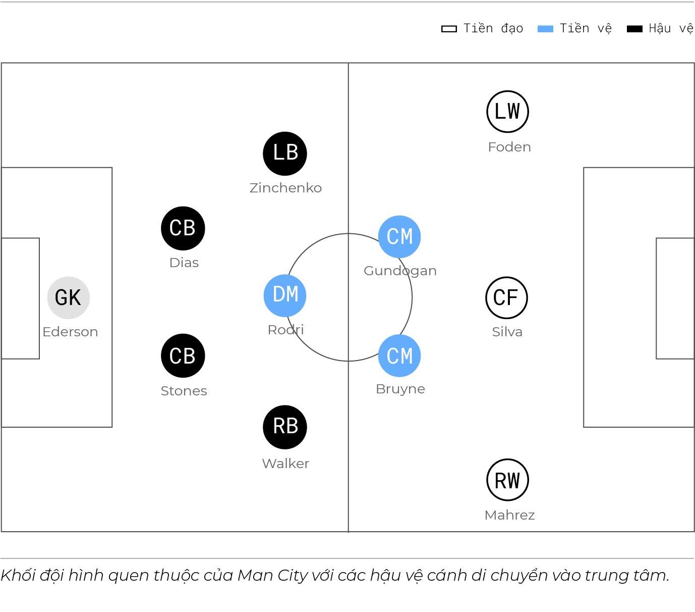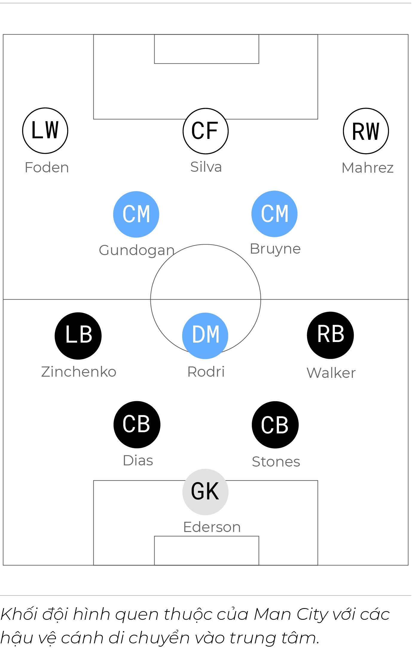 Trung vệ John Stones thường xuyên xuất hiện ở vòng tròn giữa sân để nhận bóng. Các hậu vệ cánh như Kyle Walker, Joao Cancelo được giao nhiệm vụ di chuyển vào trung tâm, tìm phương án phối hợp tốt với các đồng đội.