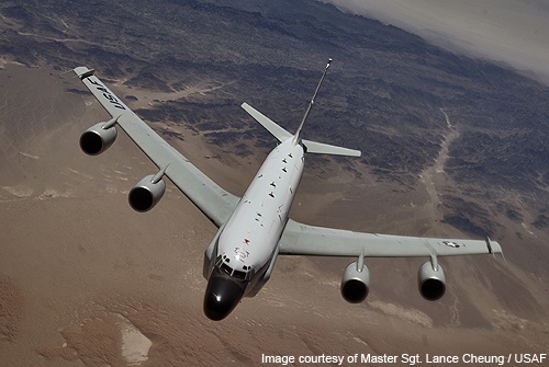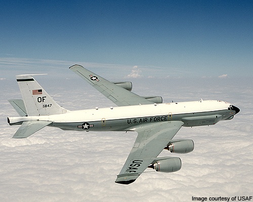 Với chiều dài 41,53 m, sải cánh 39,88 m, tải trọng cất cánh tối đa đạt 146.000 kg, vận tốc cực đại 933 km/h, phạm vi hoạt động của RC-135 là 5.500 km, còn trần bay đạt 15.200 m. RC-135 bay lên cao với vận tốc 1.500 m/phút. Ảnh: Không quân Mỹ