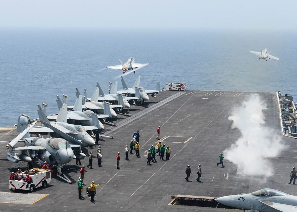 | Hai chiếc tiêm kích F/A-18 vừa cất cánh làm nhiệm vụ từ tàu sân bay USS-Nimitz. |