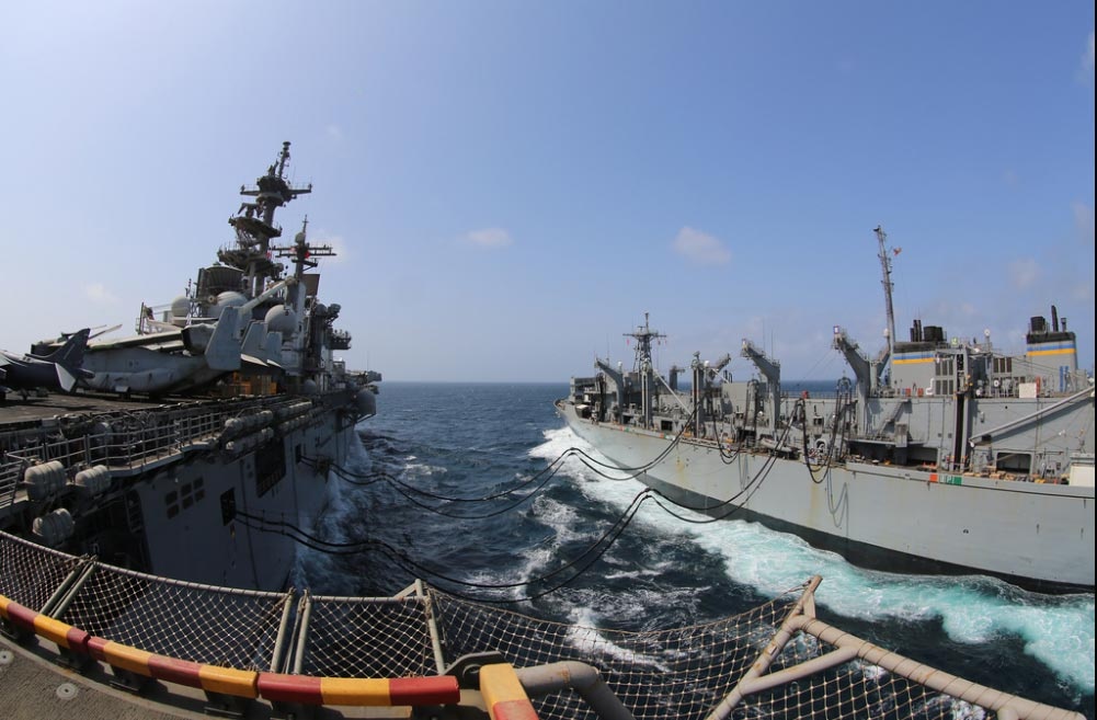| Tàu đổ bộ tấn công USS KEARSARGE (LHD 3) thuộc Hạm đội 5 đang tiếp nhiên liệu từ tàu hậu cần. Nó cũng có thể tham gia vào các hoạt động quân sự tại Syria khi cần thiết. |