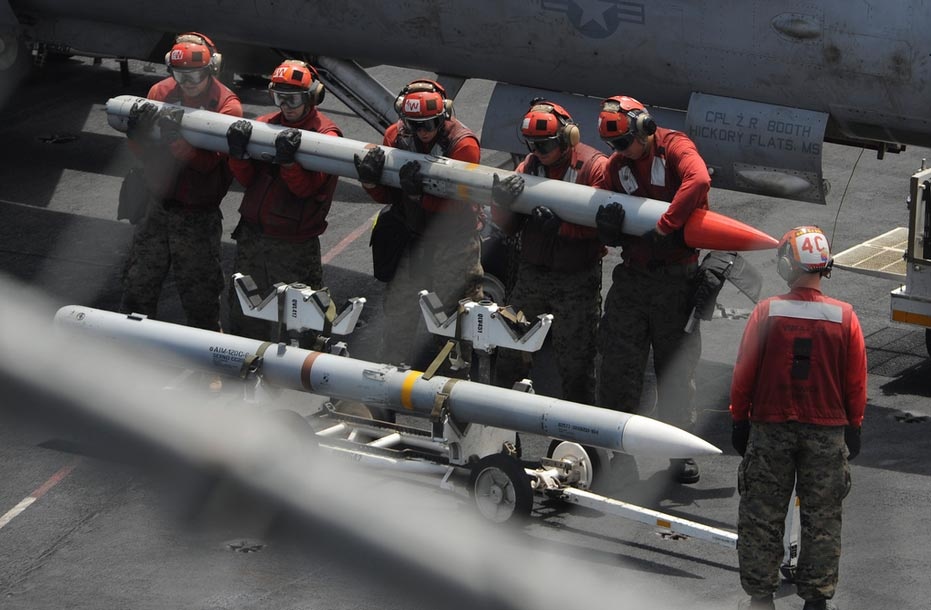 | Các nhân viên kỹ thuật đang chuẩn bị nạp vũ khí cho các tiêm kích F/A-18 sẳn sàng làm nhiệm vụ không kích Syria khi có lệnh. |