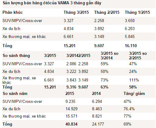 Báo cáo mới nhất từ Hiệp hội Các nhà sản xuất ôtô Việt Nam (VAMA) cho biết, tổng lượng ôtô bán ra trên toàn thị trường tháng 3/2015 đạt 16.399 chiếc, tăng 33% so với tháng liền trước và tăng 41% so với cùng kỳ năm ngoái.
