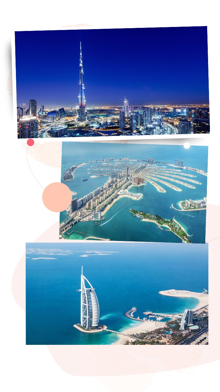 Nổi bật giữa quần đảo nhân tạo được ví như kỳ quan thứ 8 của thế giới là khách sạn 7 sao Burj Al Arab có thiết kế hình cánh buồm độc đáo, hay toà tháp cao nhất thế giới Burj Khalifa với tổ hợp thương mại, mua sắm, giải trí khổng lồ. Ngoài ra, quần đảo còn quy tụ loạt công trình nổi tiếng như tháp xoắn Cayan Tower; khu mua sắm Dubai Mall rộng hơn 502.000 m2; vườn hoa tự nhiên Dubai Miracle Garden nằm giữa sa mạc có diện tích 72.000 m2, trưng bày hơn 109 triệu bông hoa mỗi mùa; hay Rostamani - tòa tháp mê cung cao 55 tầng...