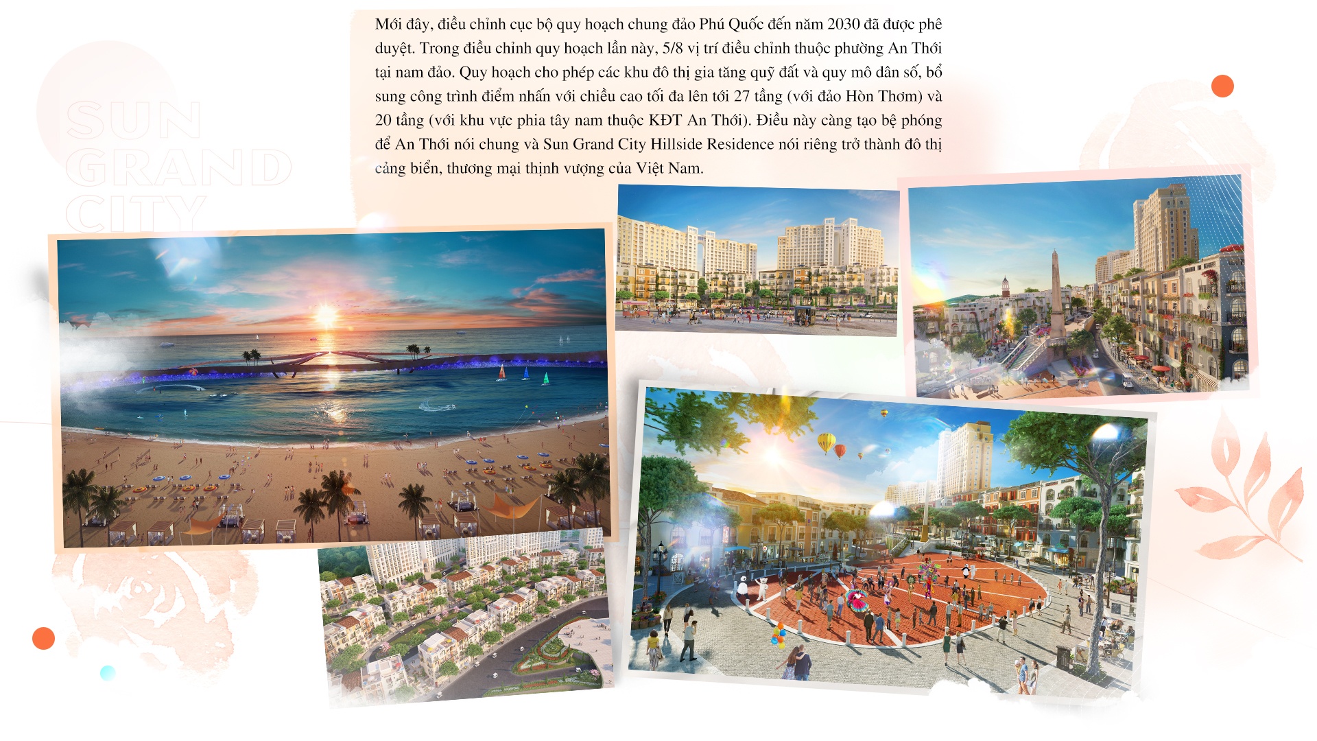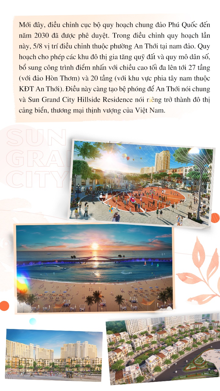 Theo đại diện chủ đầu tư, Sun Grand City Hillside Residence sẽ là một trong những dự án đầu tiên mang tòa tháp cao tầng hướng biển đến Phú Quốc, đánh dấu giai đoạn phát triển mới của thành phố đảo. Đây còn là dự án điển hình cho mô hình đô thị nén, vừa đáp ứng tốc độ phát triển đô thị du lịch, gia tăng dân số nhanh, vừa tiết kiệm quỹ đất vốn giới hạn của đảo ngọc. Còn với vai trò là một dự án BĐS, Sun Grand City Hillside Residence cung cấp cho thị trường những sản phẩm cao cấp với quyền sở hữu lâu dài, có tiềm năng đầu tư hấp dẫn.