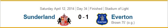 Trận đấu giữa Sunderland và Everton đã khép lại với tỷ số 1-0 nghiêng về đội khách. Bàn thắng duy nhất của trận đấu được thực hiện bởi cú đốt đền của hậu vệ Wes Brown bên phía Mèo đen.