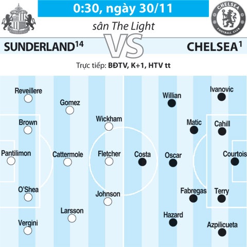 Sau 12 vòng đấu, Sunderland cũng mới giành vỏn vẹn 2 chiến thắng. Họ từng thảm bại 0-8 trước Southampton hôm 18/10. Hàng thủ đang thực sự trở thành thảm họa với HLV Gus Poyet. Họ đã thủng lưới 19 bàn/12 vòng, là đội có hàng phòng ngự tồi thứ 4 Premier League, chỉ khá hơn mỗi Burnley (20), Crystal Palace (21) và QPR (23). Sự ra đi của Borini cùng với việc Fletcher không tìm lại được phong độ cao sau chấn thương dài ngày cũng khiến khả năng ghi bàn của Sunderland suy giảm rõ rệt. Tới thời điểm này, họ mới có 12 bàn tại Premier League. Một đội bóng kém cỏi như Sunderland, liệu có đáng để đặt niềm tin? Cuối cùng, lịch sử cũng ngoảnh mặt với Mèo đen. Trong 9 lần gần nhất tiếp Chelsea tại The Light ở Premier League, họ toàn thua cả 9 trận.