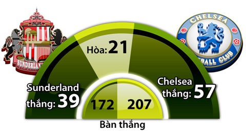 Chelsea áp đảo toàn diện Sunderland trong những lần đối đầu khi thắng tới 57 và chỉ thua 39 trận/117 lần đụng độ.