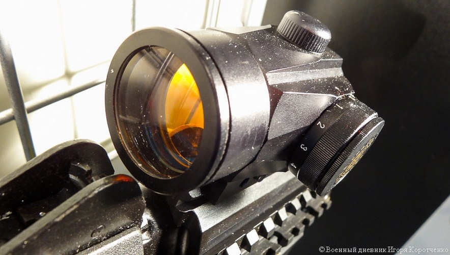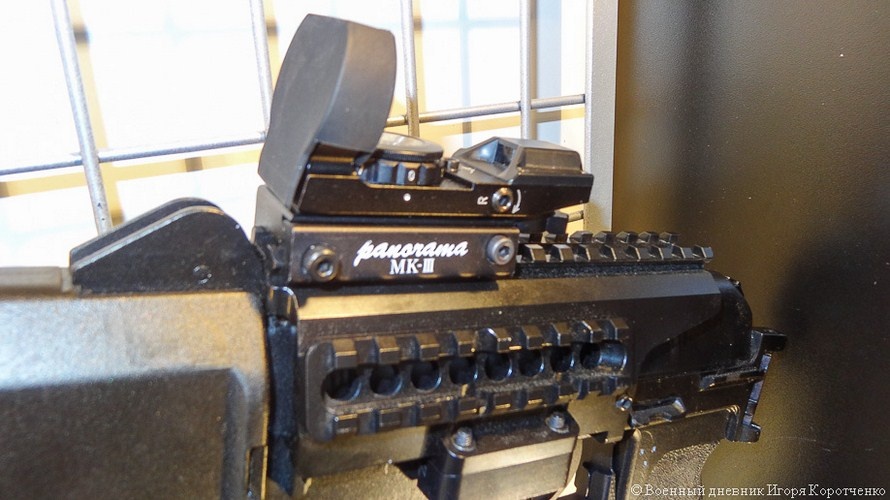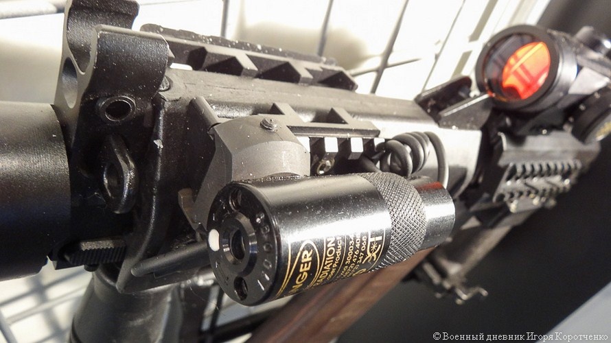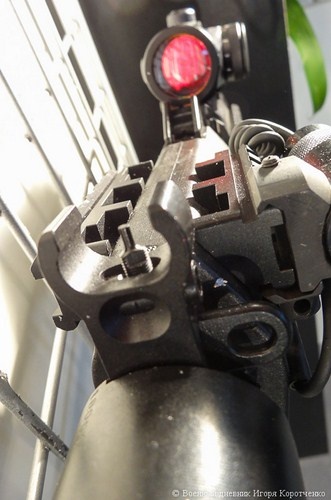 | Cận cảnh thay ray Picatinny và kính ngắm chỉ thị điểm đỏ trên súng SR-3M. |
