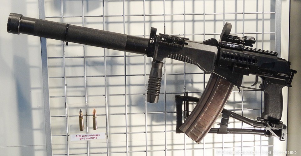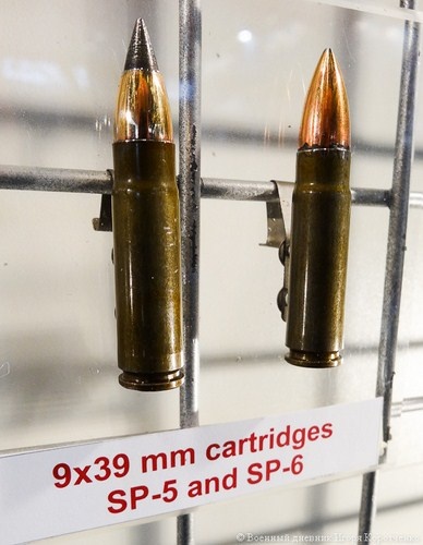 | Cận cảnh mẫu SR-3M hiện đại hóa với thanh ray thép Picatinny và 2 loại đạn xuyên giáp 9x39 mm SP-5 và SP-6. |