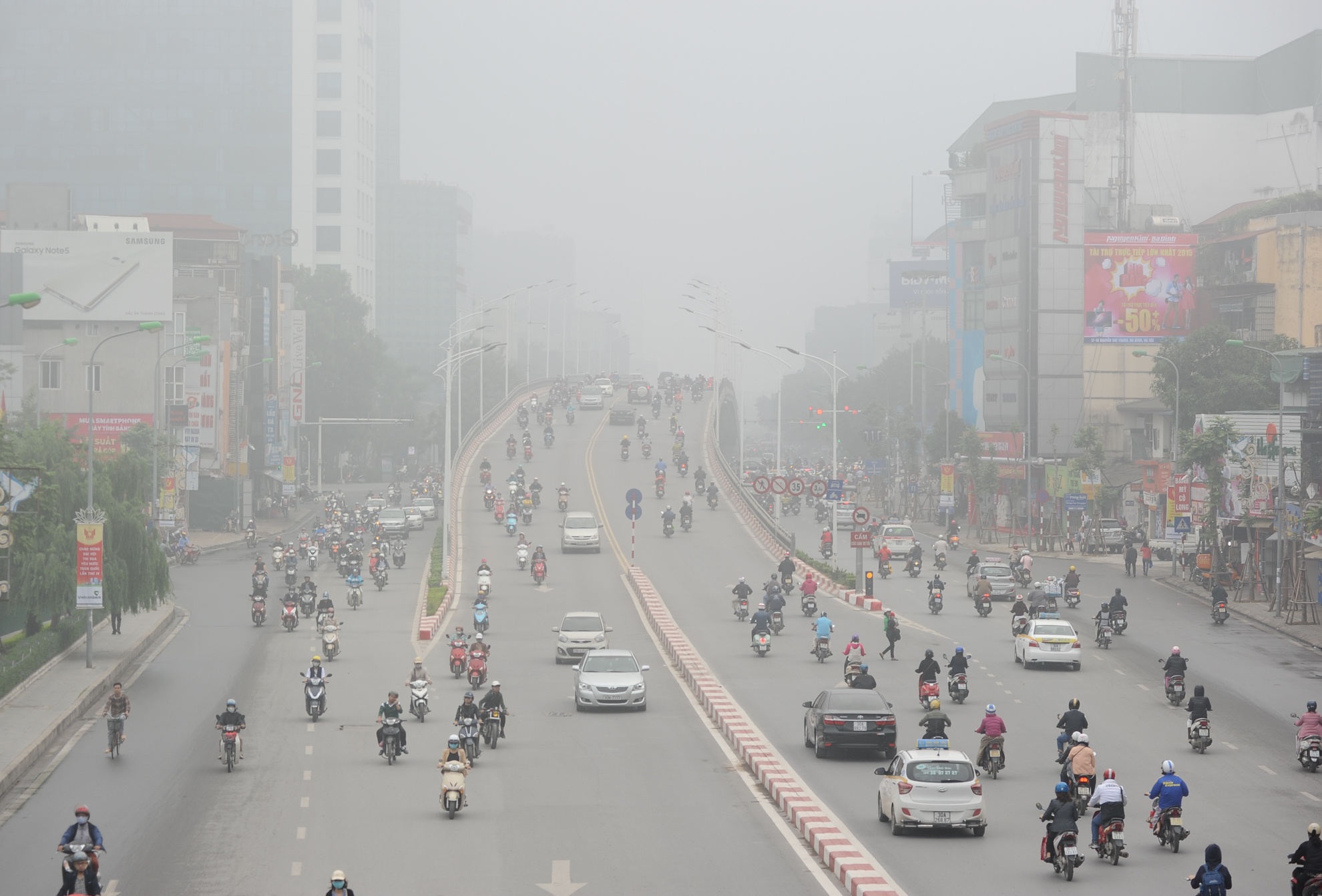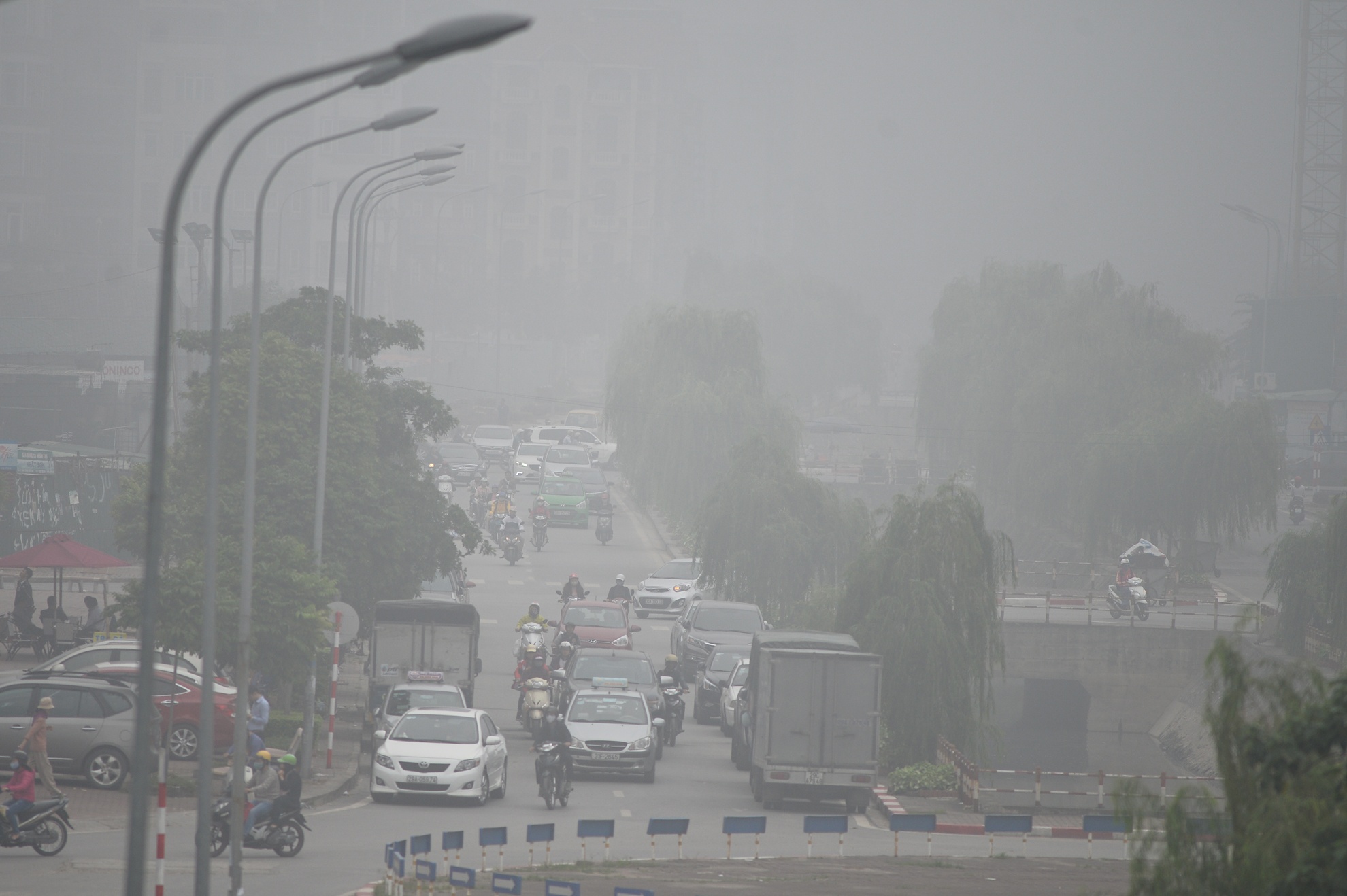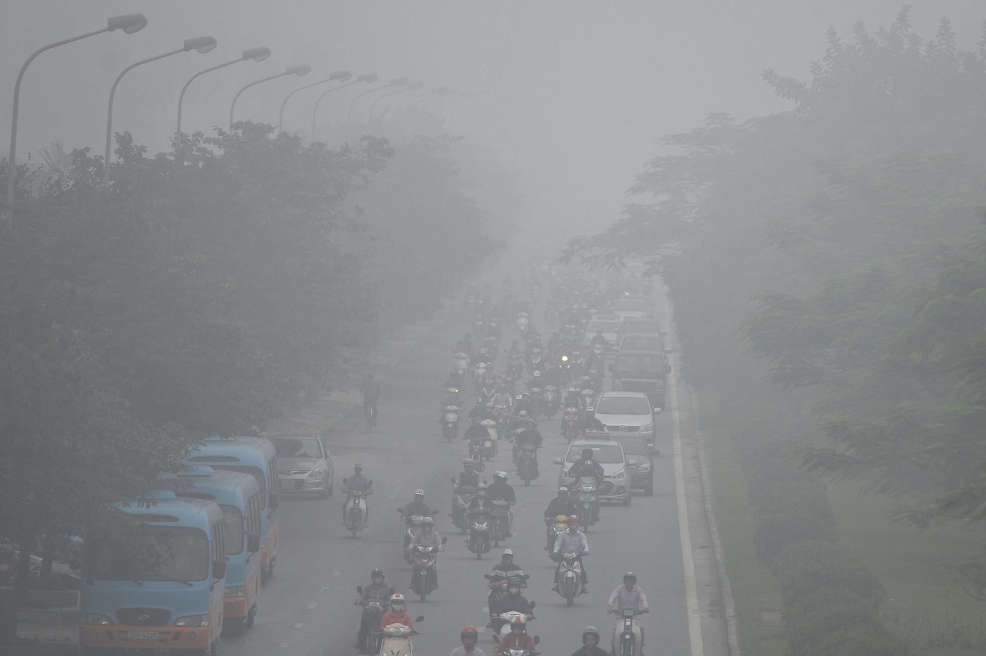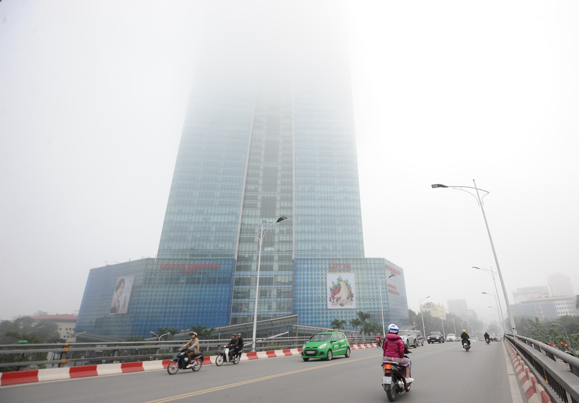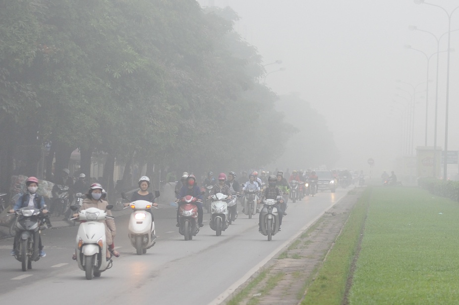 Sáng 2/12, đường phố Hà Nội bị bao phủ bởi những làn sương màu trắng đục, dầy đặc khiến cho tầm nhìn bị hạn chế, các tòa cao ốc "biến mất" nhiều giờ.