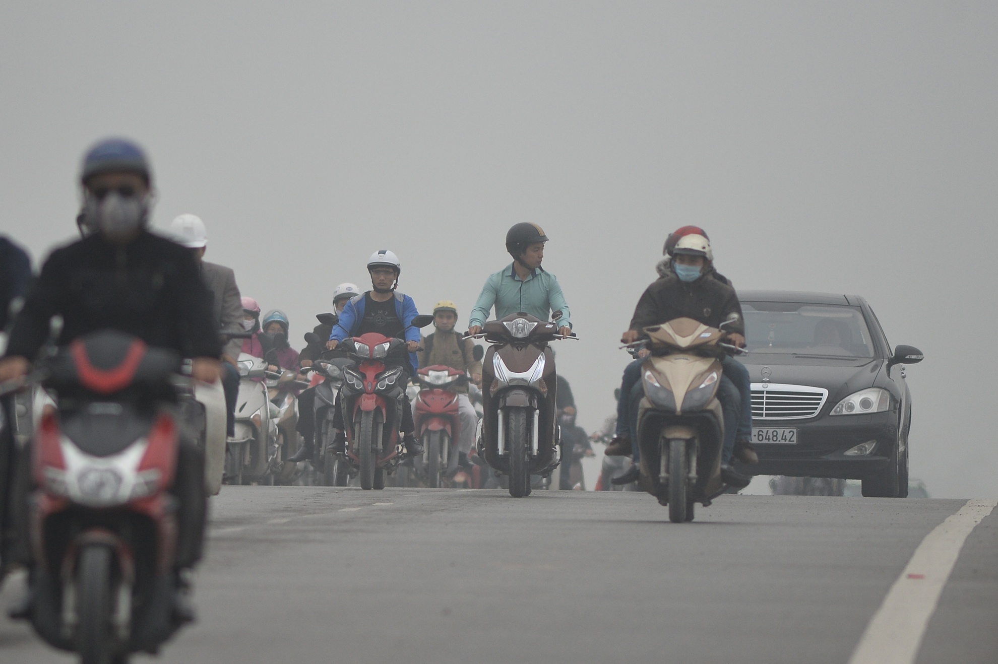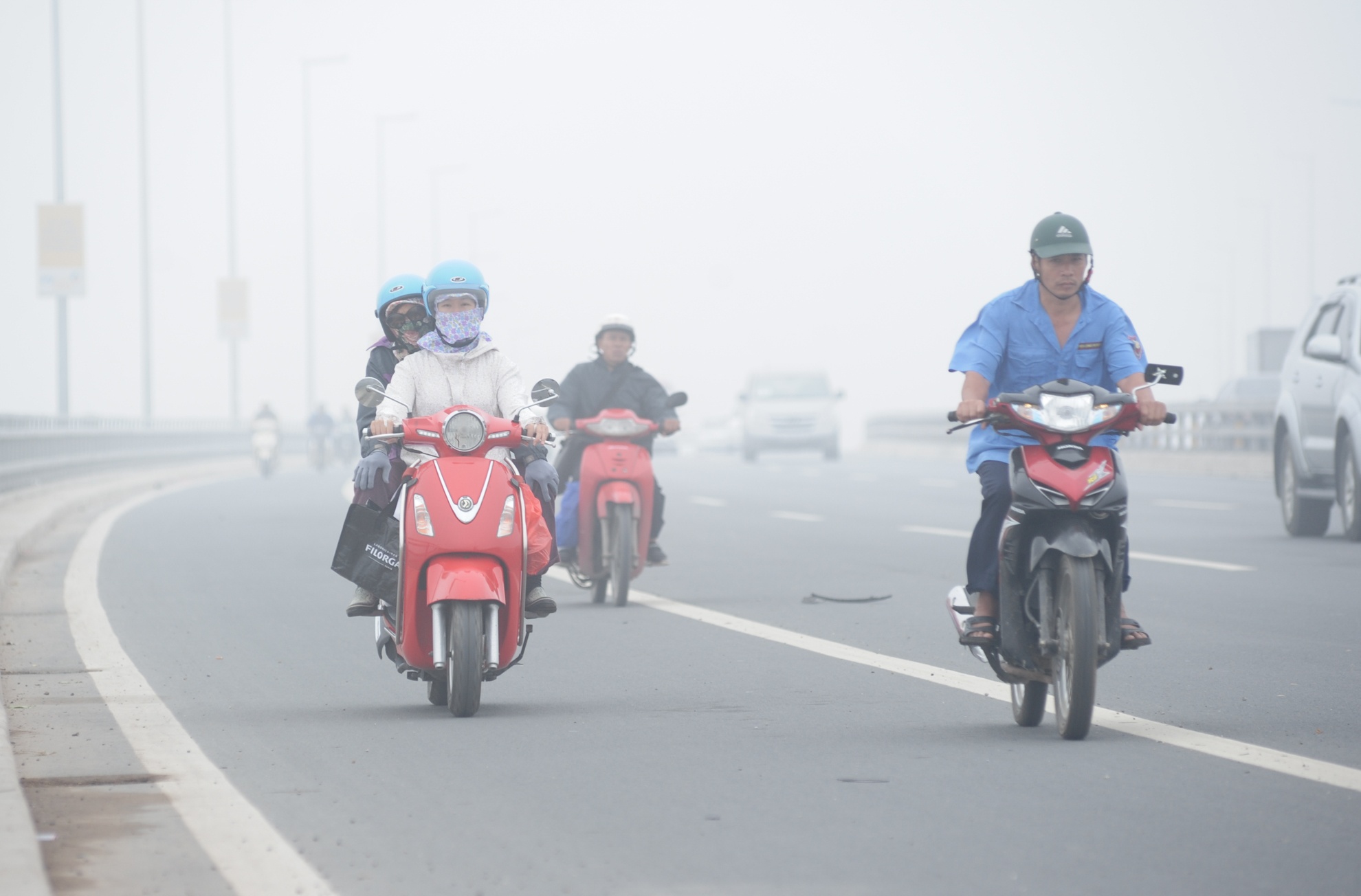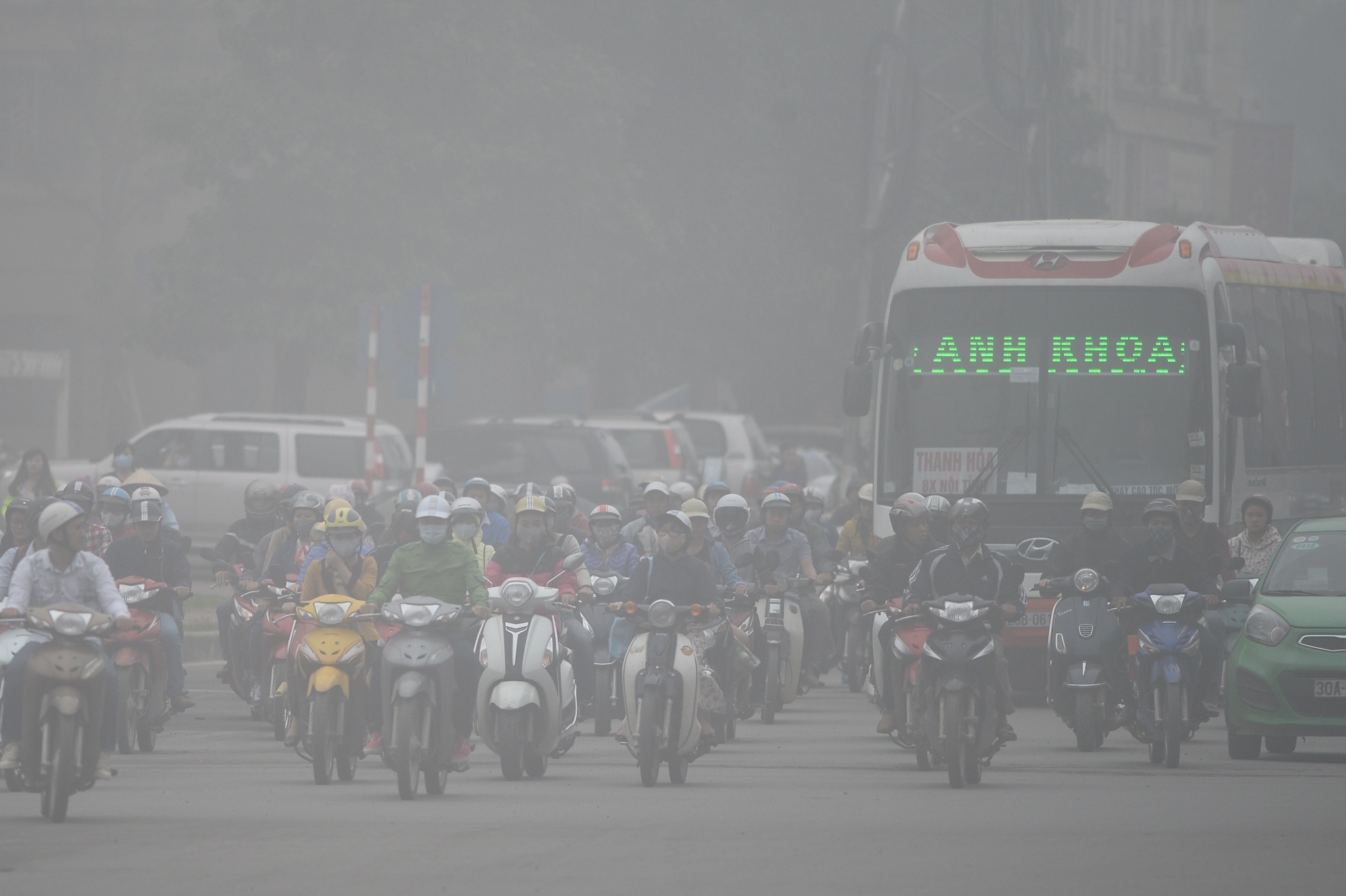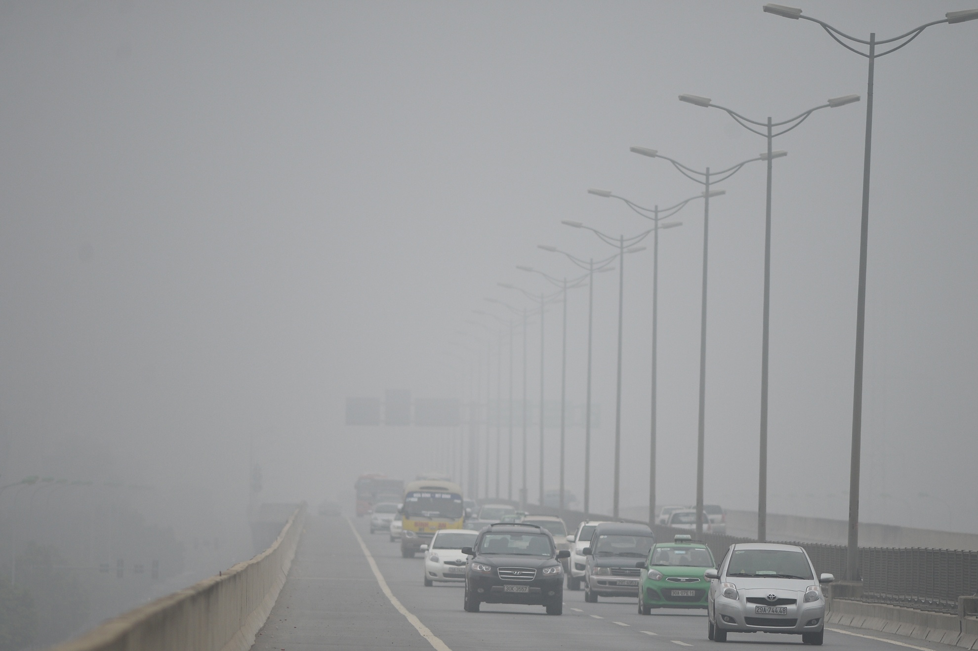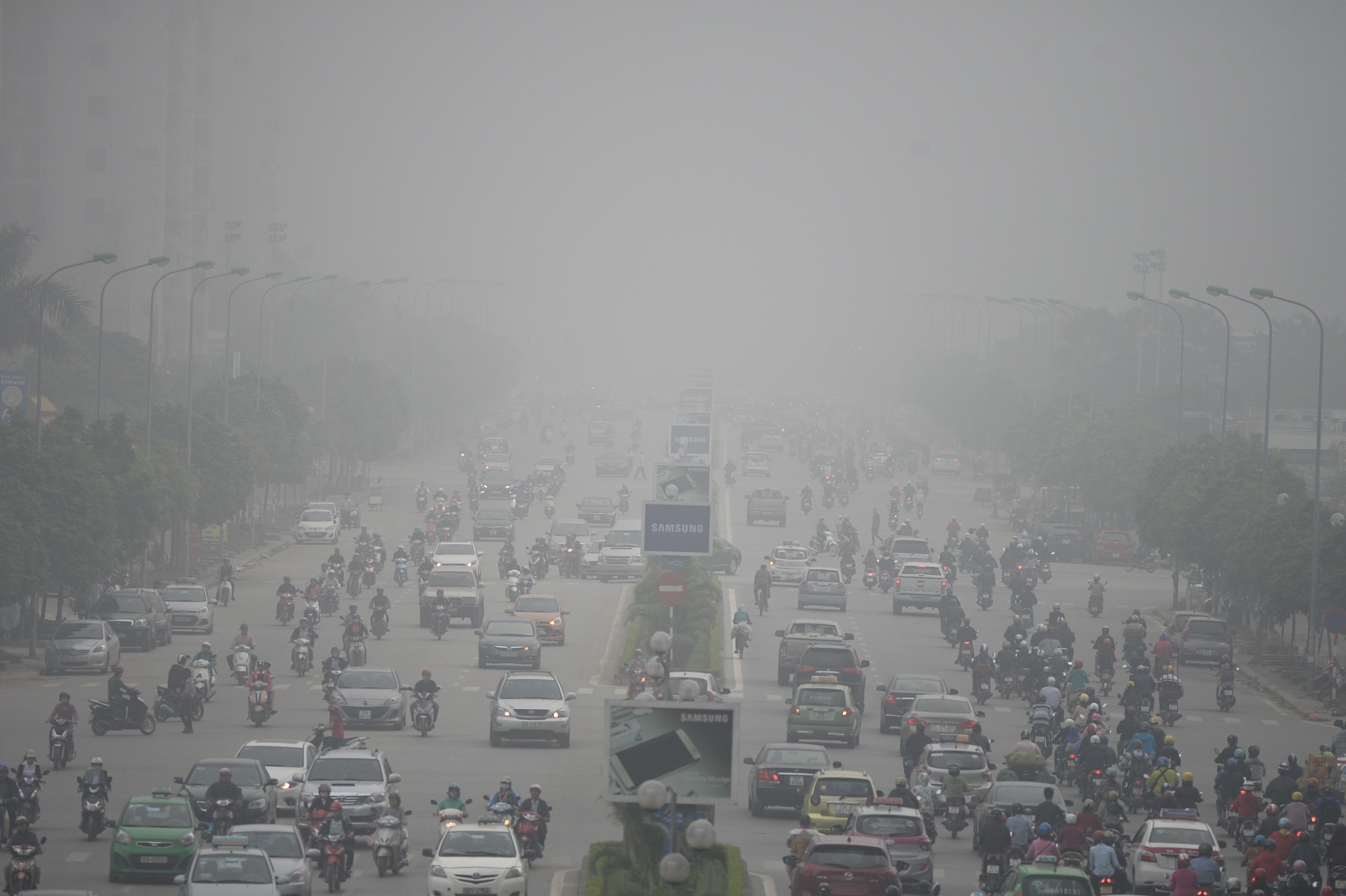 Sáng 2/12, đường phố Hà Nội bị bao phủ bởi những làn sương màu trắng đục, dầy đặc khiến cho tầm nhìn bị hạn chế, các tòa cao ốc "biến mất" nhiều giờ.