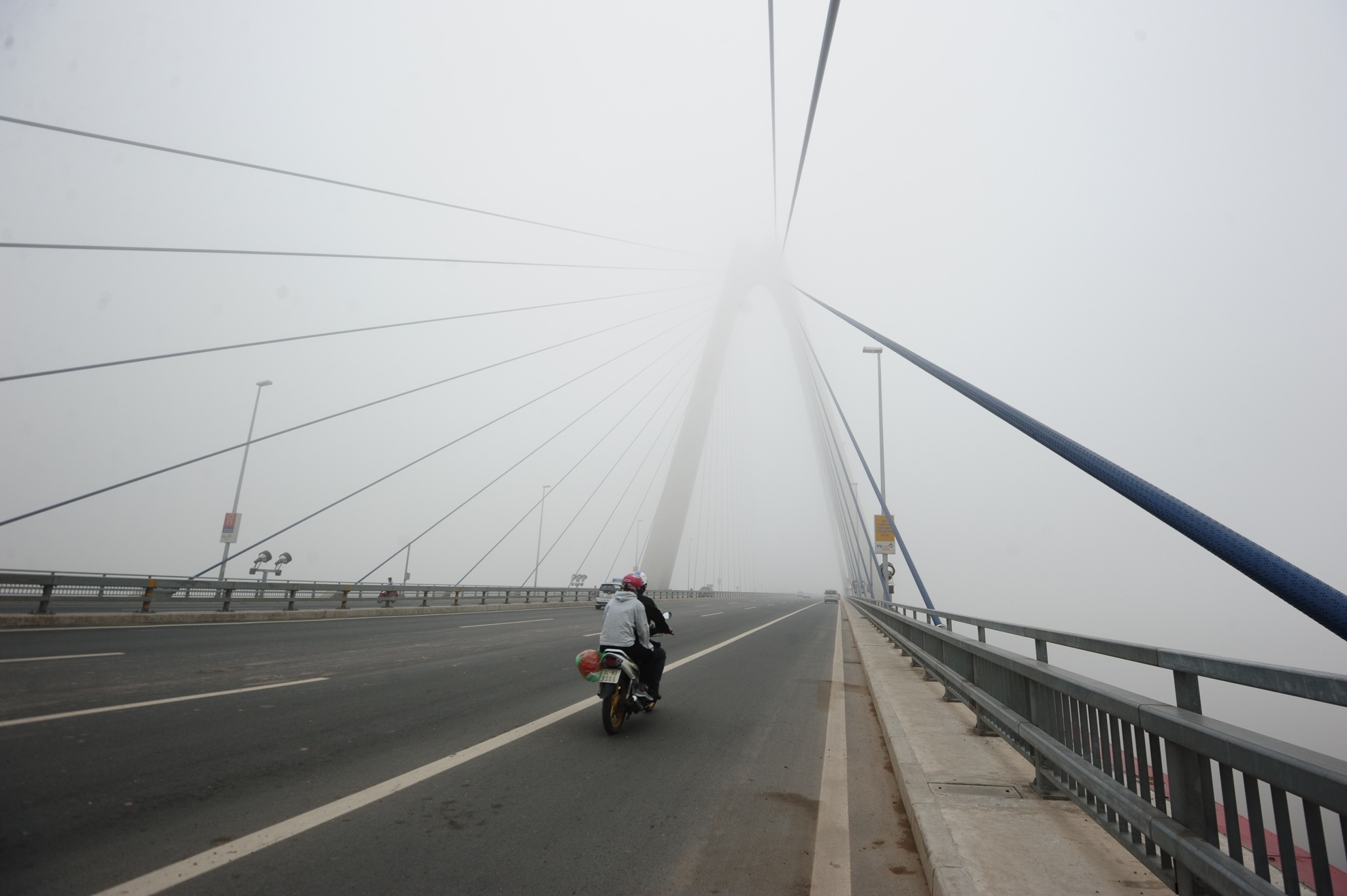 | Đi trên các cây cầu vượt, phía sau lưng người điều khiển phương tiện chỉ toàn màu trắng đục. |