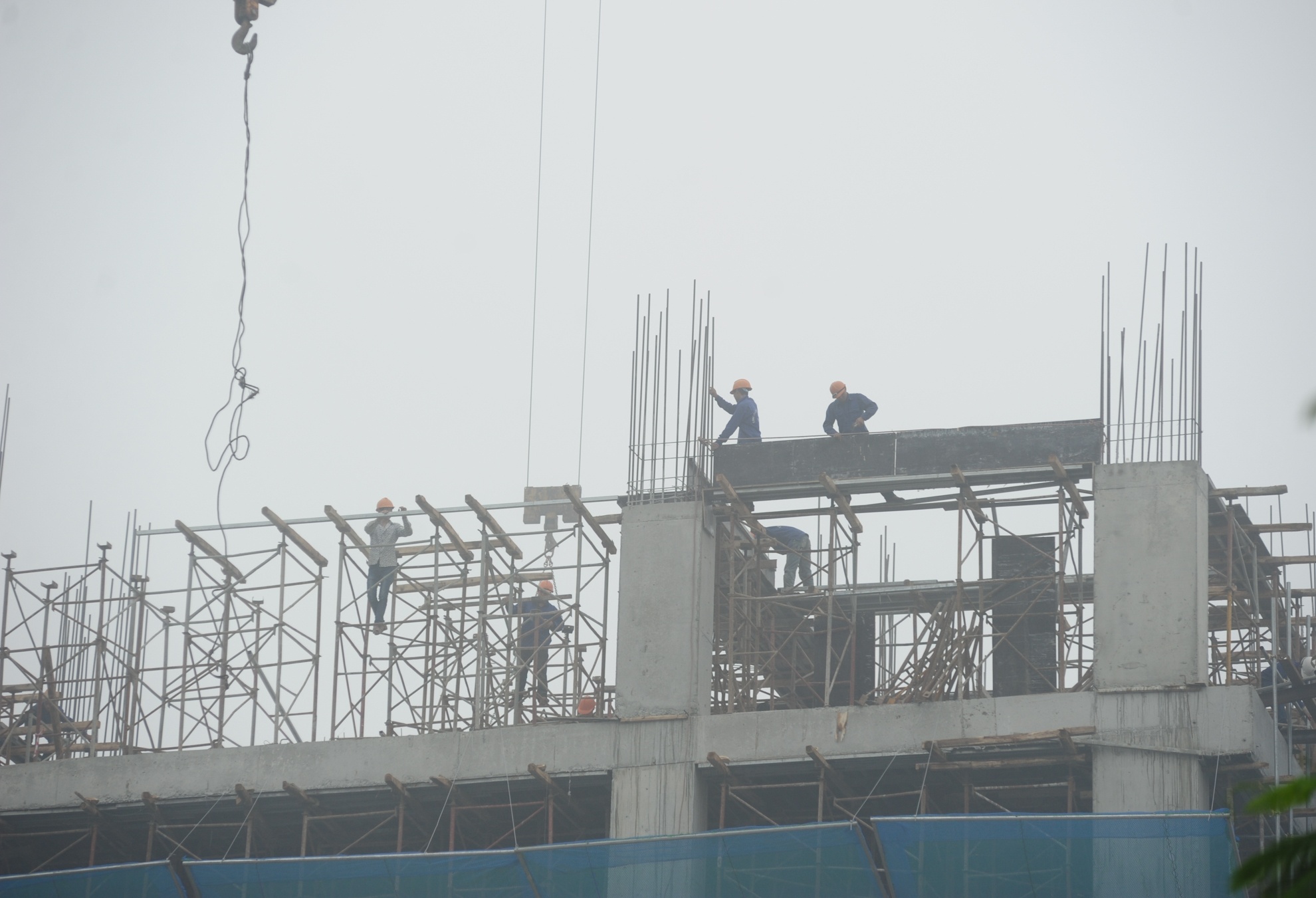 | Công nhân công trường xây dựng làm việc trong điều kiện thời tiết không thuận lợi. |