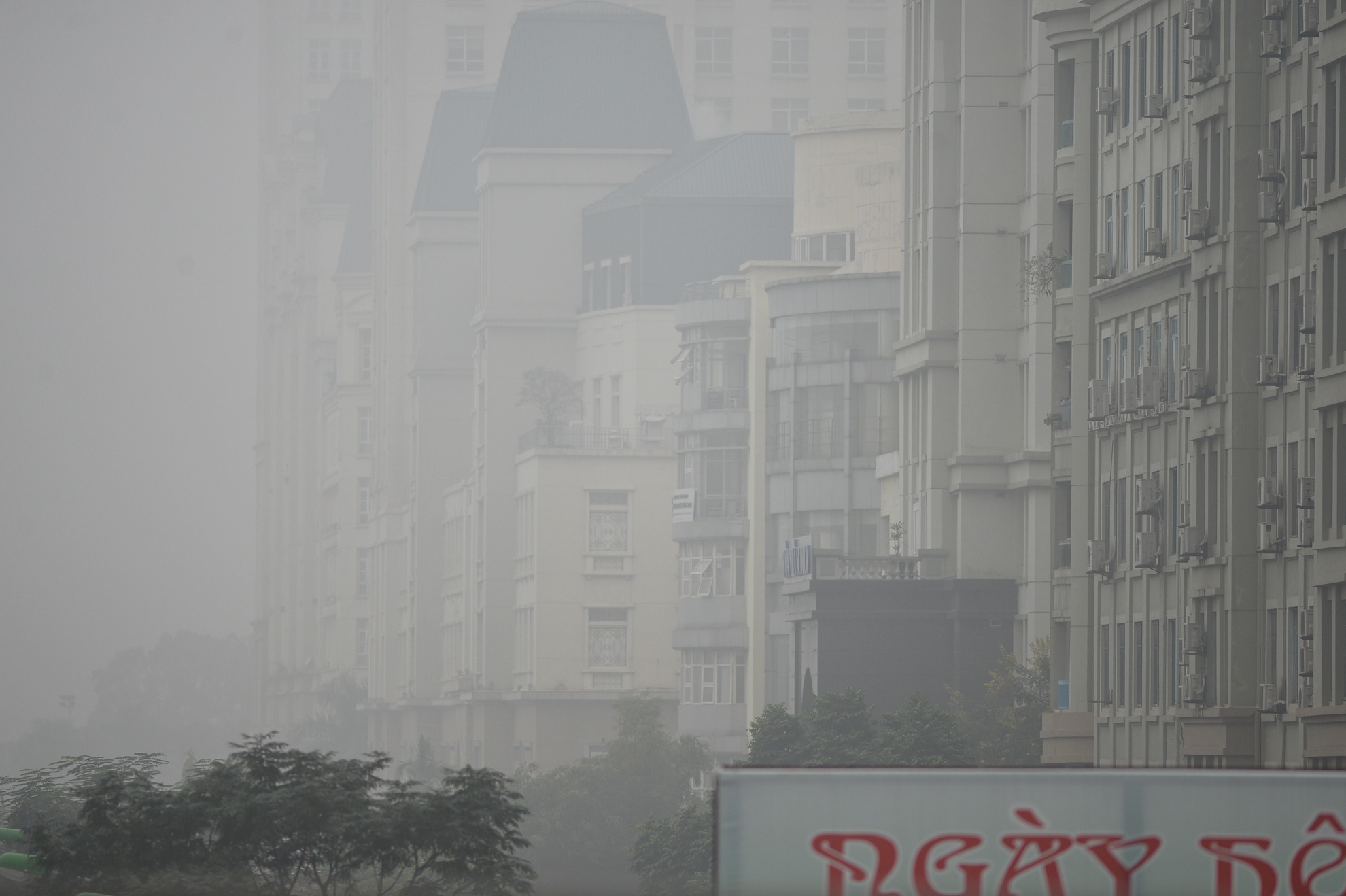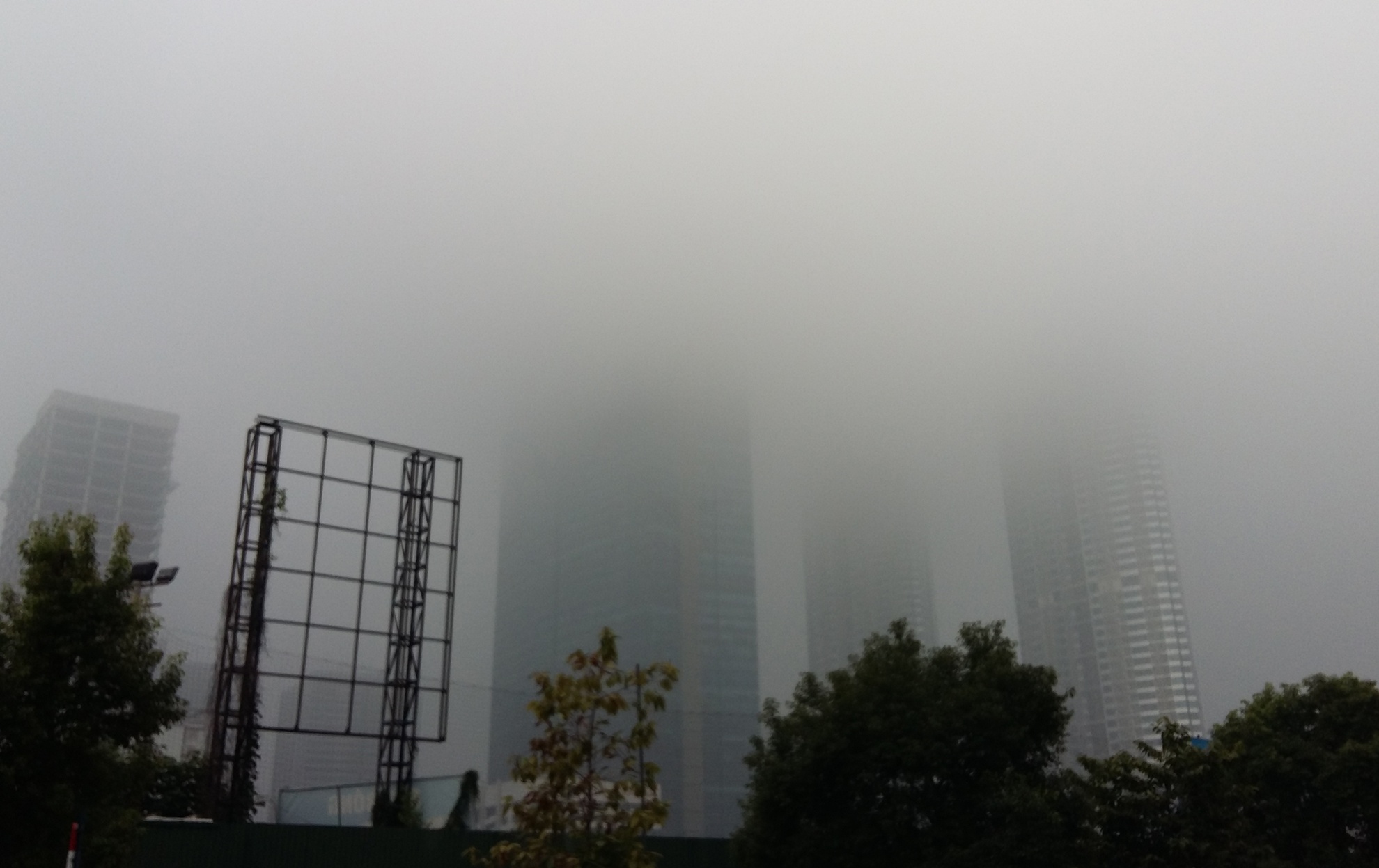 | Các khu đô thị ở khu vực phía Tây Nam (quận Nam Từ Liêm) mờ ảo phía sau làn sương. |
