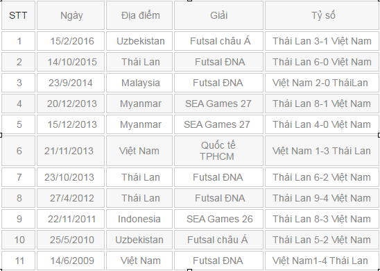 | Thống kê thành tích đối đầu giữa futsal Việt Nam và futsal Thái Lan. |