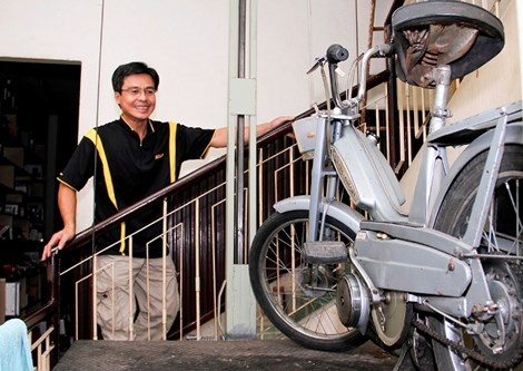 Đứng trên ban công, phóng mắt về phía con đường nhìn dòng người ngược xuôi, anh Sơn cười và chia sẻ: "Cái thú vui nhỏ của mình, thật duyên cũng làniềm vui của bà xã". Vậy là, tình yêu với Vespa của người đàn ông tuổi ngũ tuần ấy vẫn thấp thoáng hình ảnh một người phụ nữ vén khéo, đảm đang.