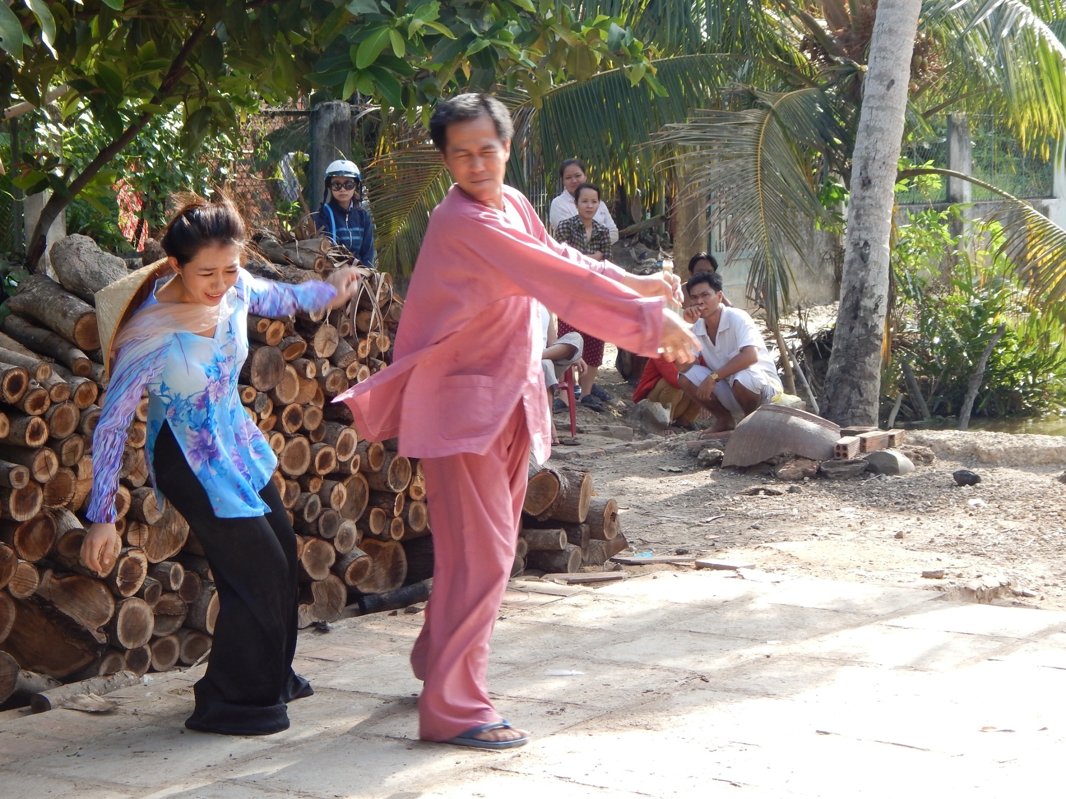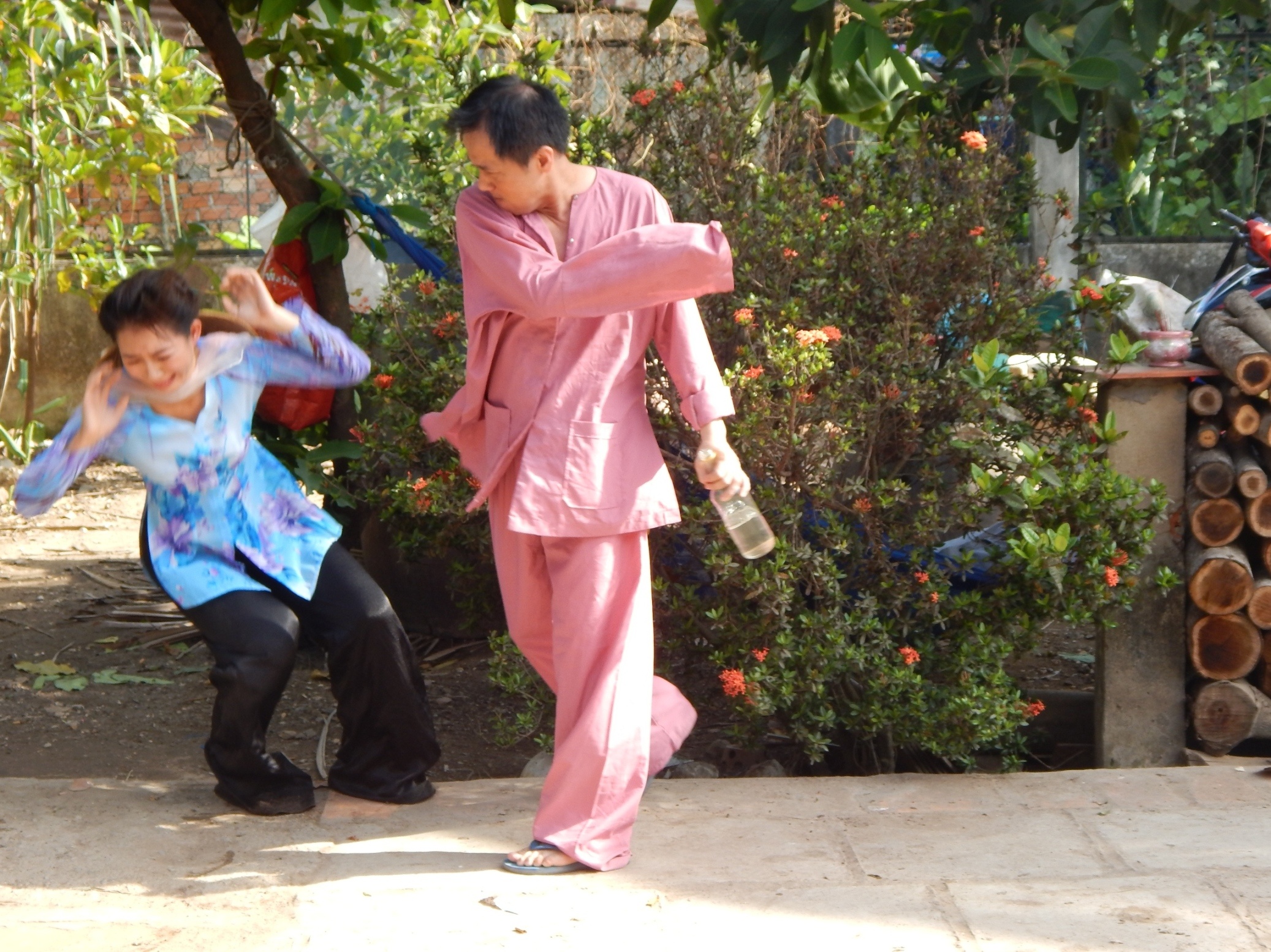 PGS Sơn chân nọ xọ chân kia với đôi dép lào cũ rích. MC Trà Mi tất tả chạy đón chồng và bị một trận đòn nên thân… Đổ mồ hôi, té ngã nhiều lần, Trà Mi đỏ cả mặt vì nhiều cái tát tai là những hình ảnh đắt giá. Chiếc nón lá của Trà Mi tơi tả và cái ngã lăn của cả hai người với tóc tai rũ rượi và quần áo tơi bời có thể dự đoán được bi kịch của một gia đình.